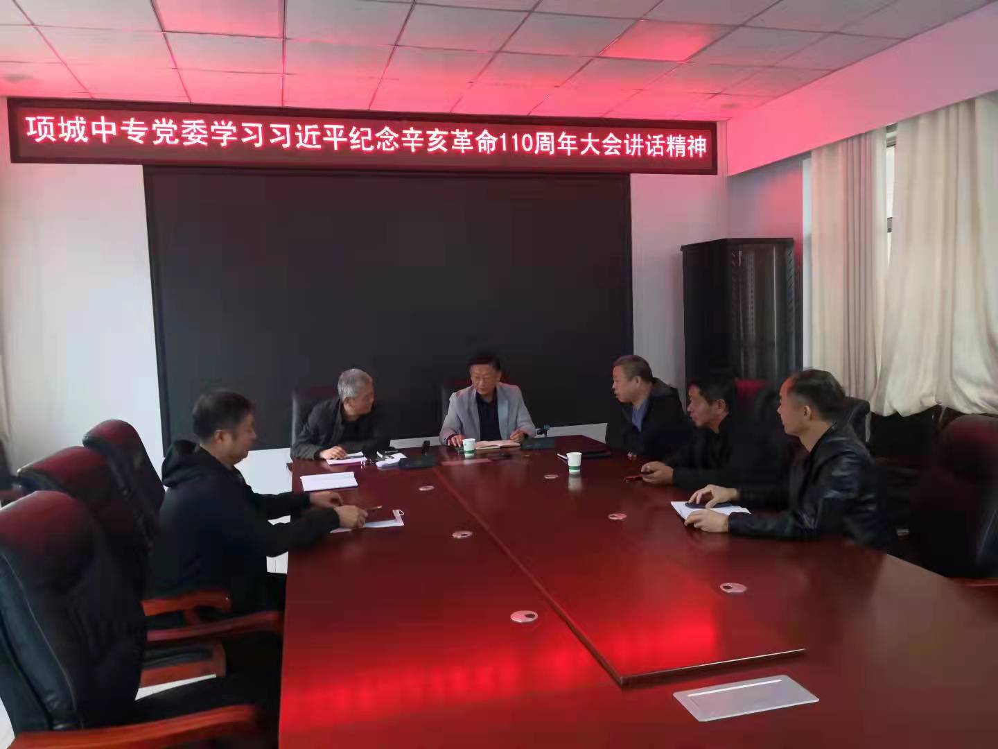 10月16日,项城中专党委在二楼会议室开展学习习近平纪念辛亥革命110周年大会讲话精神专题会,校党委班子成员参加会议,党委书记马玉红主···