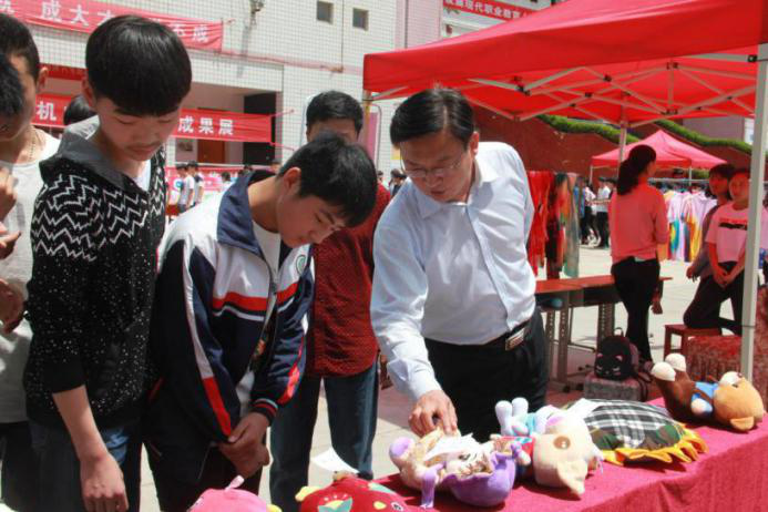 5月10日上午,学校举行职业教育活动周暨技能大赛作品展演启动仪式,项城市领导以及教体局局长张国旗参加,并分别作重要讲话。服装旅游专业负责人王赟带领专业部教师从早晨六点开始布置展示区,将扎染的围巾、再造的T恤、手工制作、服装、餐饮摆台展示、专业介绍展板一一陈列出来,迎接各界来宾的参观、指导。王赟主任、于坤平、龙启冲、李晓霞、牛瑞等老师,为前来参观的老师、学生做详细的讲解,对优秀毕业生、比赛、活动等进行宣传。
