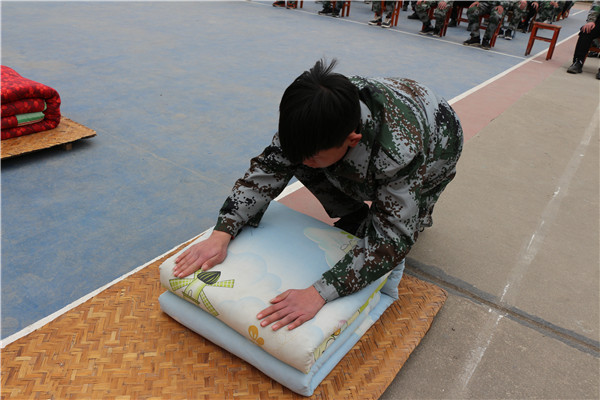 在军事训练科目表演中,各方队整齐划一,口号嘹亮,依次通过大会主席台。尽管天公不作美,但这丝毫不能影响各方队如火的热情。军事技能训练展示时,同学们认真表演,听从指挥。站军姿,气宇轩昂;踢正步,意气风发;唱军歌,斗志昂扬。呐喊声此起彼伏,响彻了整个校园;内务整理展示时,同学们一丝不苟的整理着被褥,不一会一条条被褥就变成了整齐的“豆腐块”。
