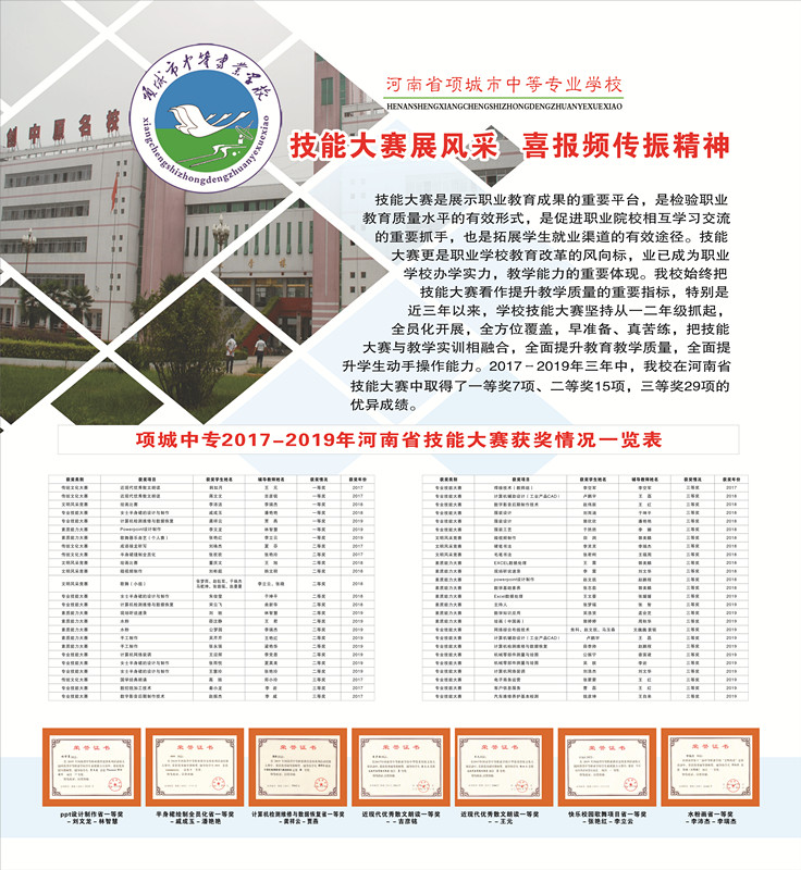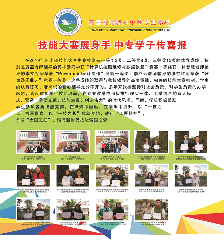 技能大赛展身手 中专学子传喜报在2019年河南省技能大赛中我校喜获一等奖3项,二等奖8项,三等奖13项的优异成绩。特别是贾燕老师辅···