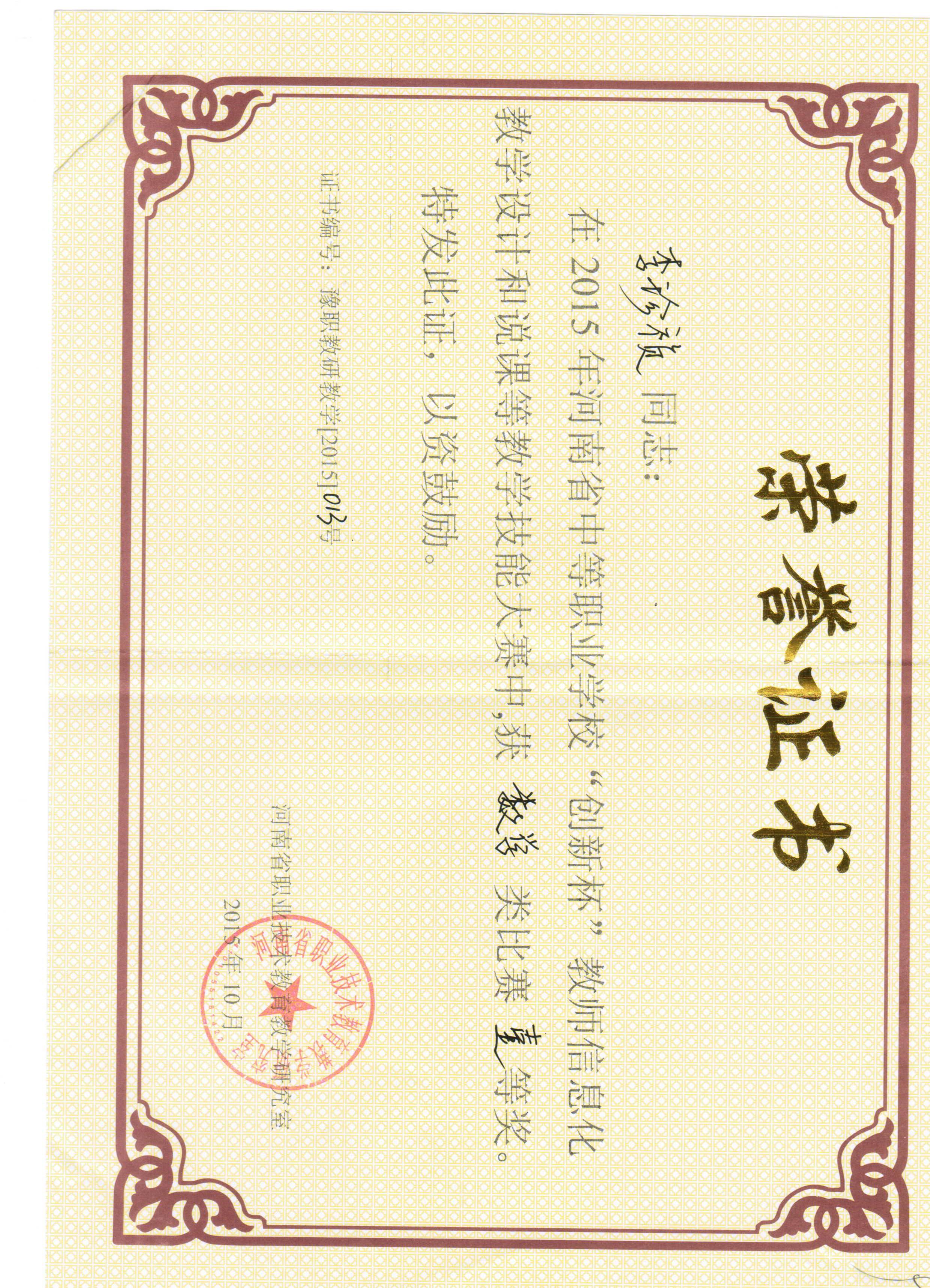 2015年10月17号,数学组教师张世娇、李珍祯、孟银霞代表我校在郑州参加河南省中等专业学校“创新杯”教师信息化教学设计和说课等教学技能大赛,并取得优异成绩。