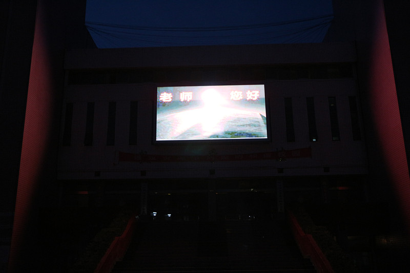 在第34个教师节来临之际,我校响应教育厅号召,早早就在学校教学楼前的液晶大屏上打出:“老师,您好!”及“弘扬高尚师德,潜心立德树人等字幕”,以表达对全体教师的节日祝福。