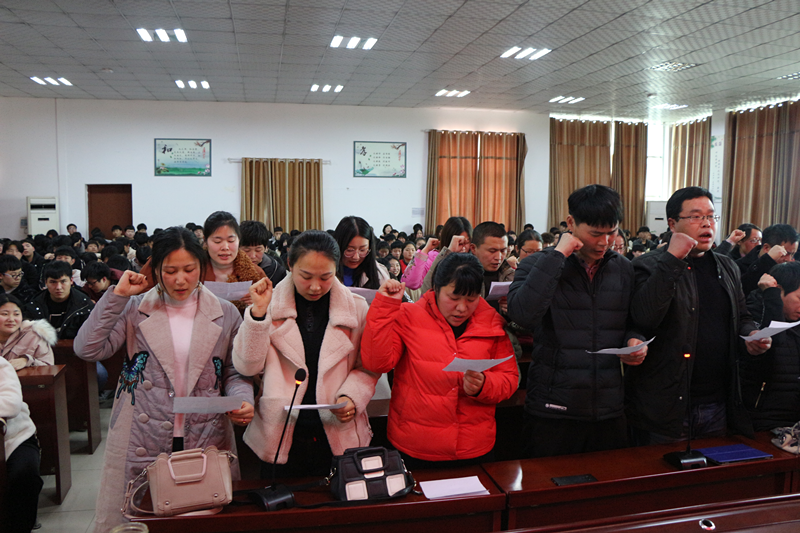 全体教师举起右手,庄严宣誓:肩负使命,科学备考;认真工作,严抓落实;奉献热忱,关爱学生;耐心答疑,热情指导;精讲巧练,把握方向;甘做人梯,培育栋梁。做学生坚强后盾,为高考保驾护航。决战高考,倾尽全力;奋勇拼搏,再创辉煌!振奋人心的誓词在会场回荡,每位教师都激情满怀,喊出了心底的那份责任和担当!
