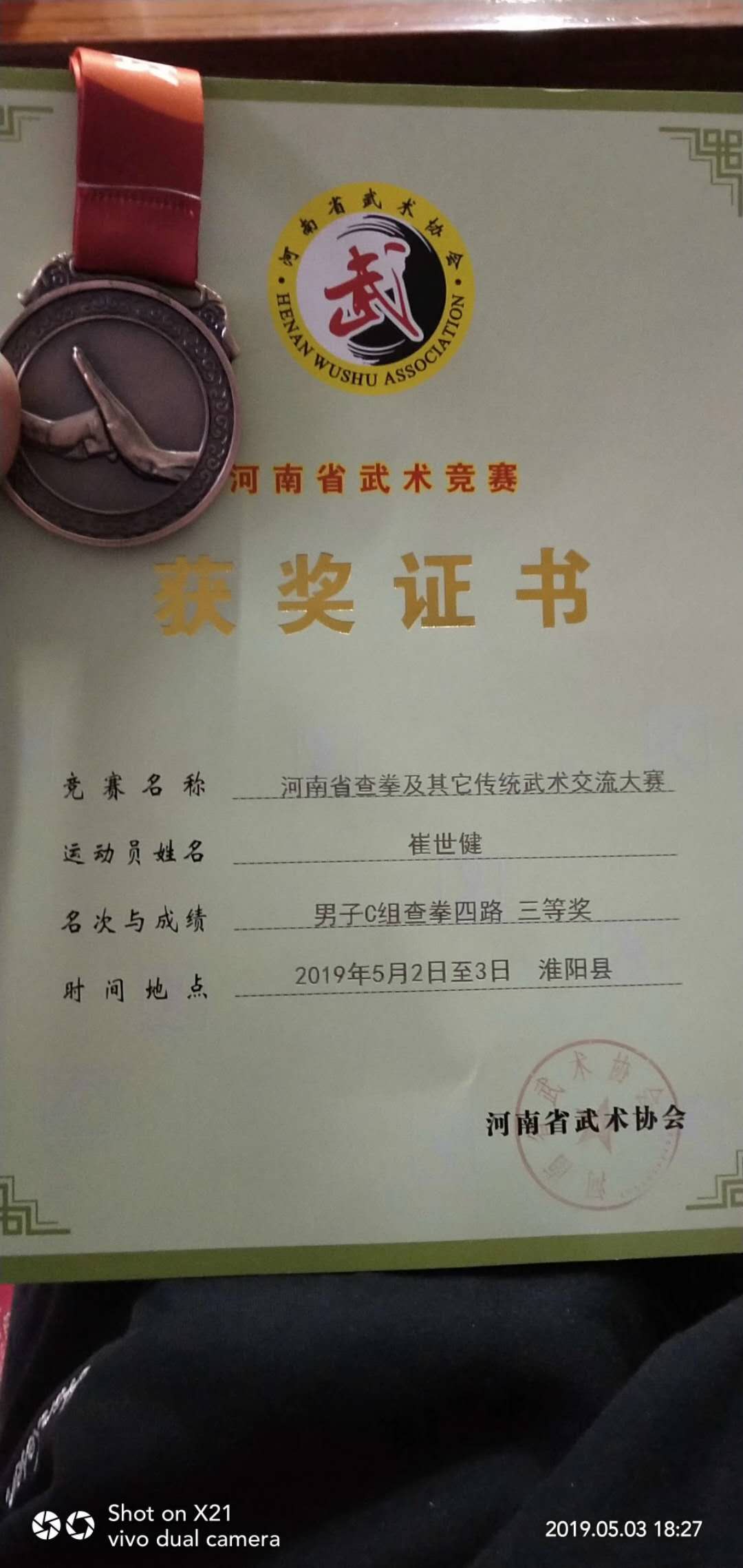 2019年5月2日至3日在河南省淮阳县举办的“武韵中原”河南省第三届传统武术大赛中我校16秋运动训练班学生崔世建获得河南省查···