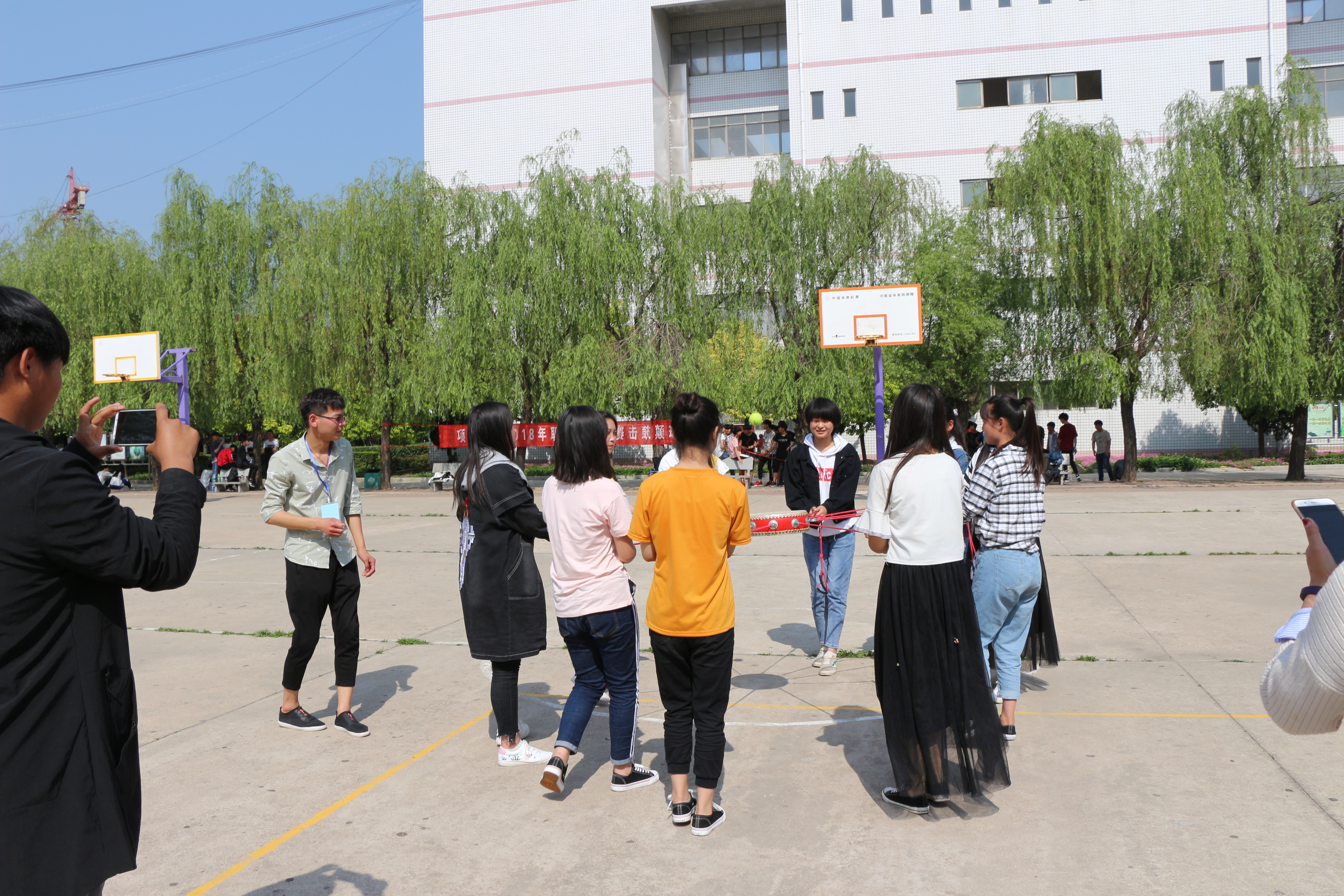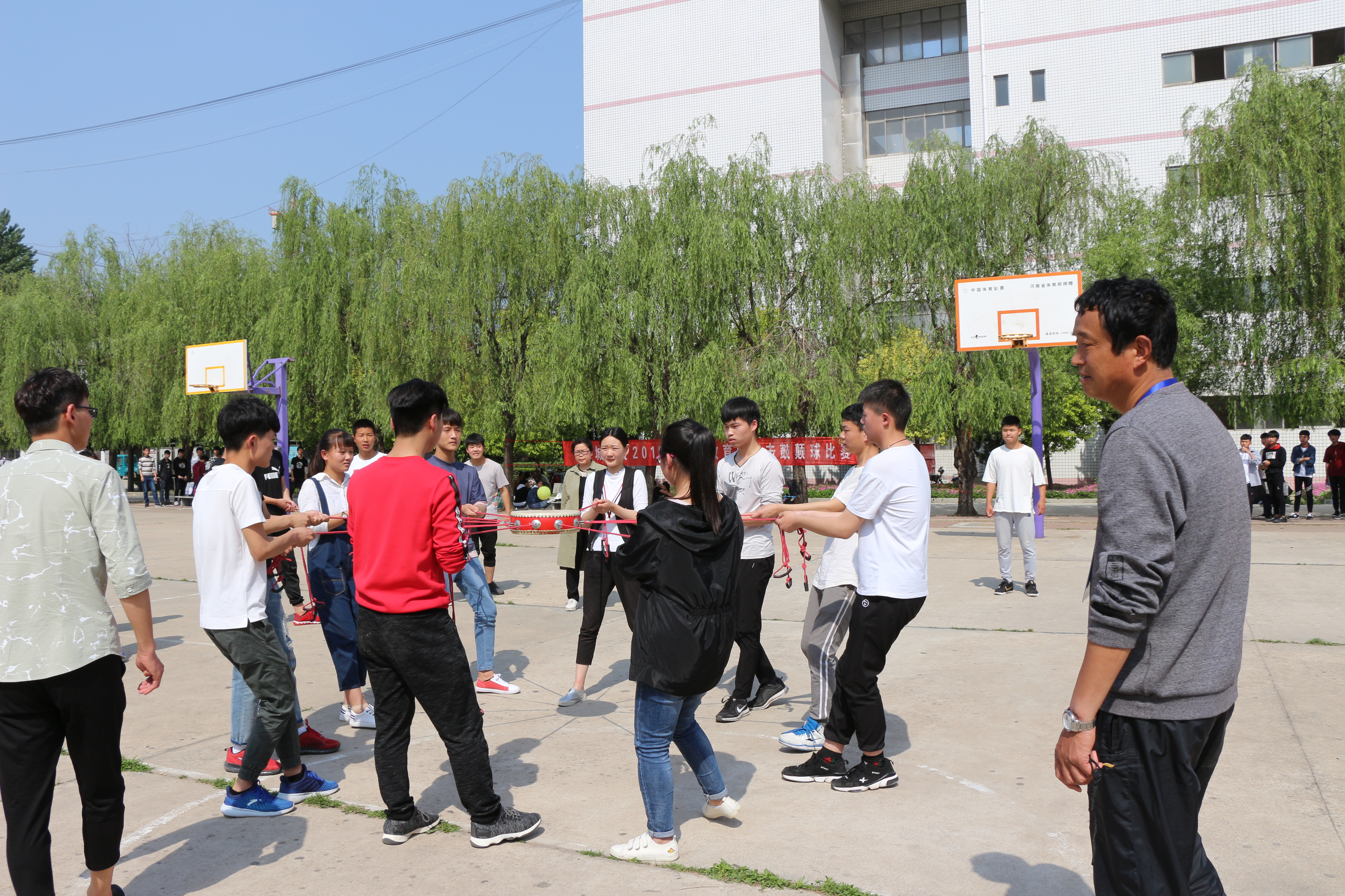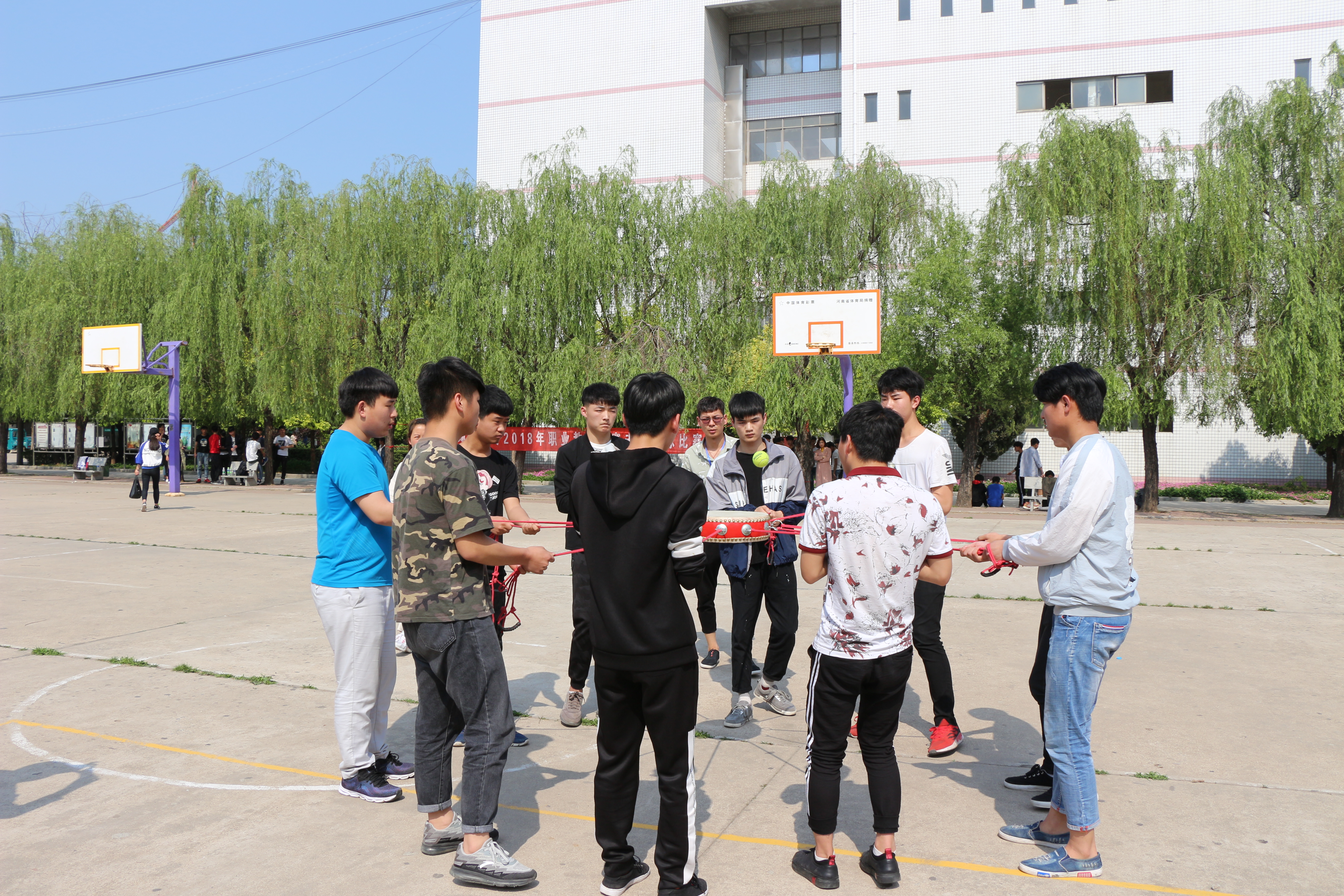 2018年4月27日下午,项城中专篮球场举行了“击鼓颠球”比赛,通过预赛后有7支代表队进入了决赛。参加决赛的代表队冒着29度的高温,在烈日下进行了比赛。彰显了我校学生朝气蓬勃,团结进取的青春气息。学生们手拉绳子,绷直鼓面,精神高度紧张富有节奏的颠起网球,最终。2017秋计算机二班参赛队以431次的三分钟颠球记录获得本次击鼓颠球冠军。
