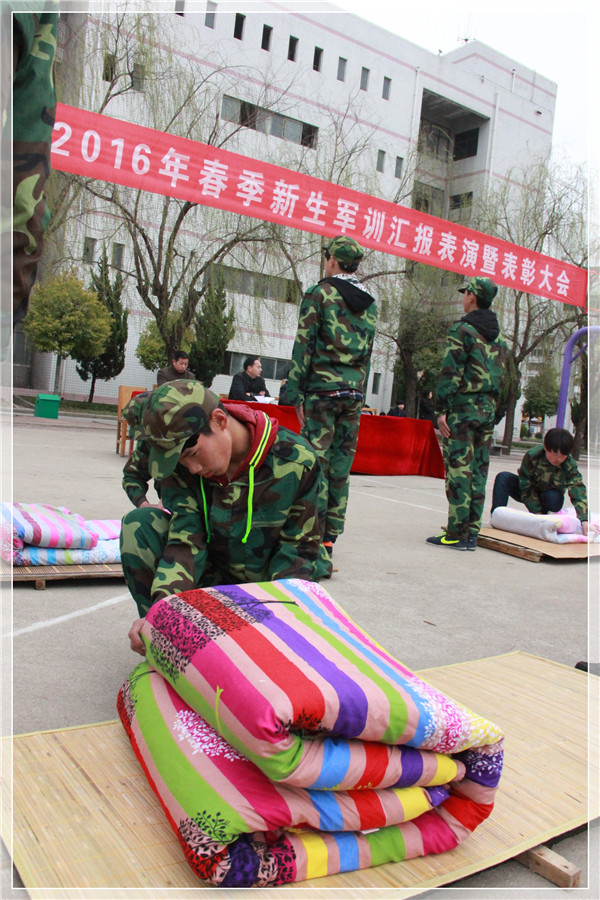 汇报表演在雄壮的国歌声中拉开帷幕。在激扬的国歌声中,2016年春季所有新生整齐的列好方阵,接受学校校长和教官们的检阅。会操表演、正步走、齐步走、内务整理等表演赢得观看学生的阵阵掌声。尤其是内务整理,面对乱成一团的被子,只需30秒,就把一双被子叠的棱角分明,真正做到了快速、高效、整洁,引得周围同学掌声不断。