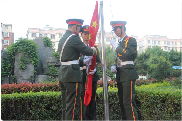 迎着朝阳,国旗班的升旗手们护卫着鲜艳的五星红旗入场,他们着装整齐、步伐矫健。随后,伴随着《义勇军进行曲》的响起,大家集体行注目礼,庄严肃穆。冉冉升起的五星红旗激发了同学们不断向上的斗志,点燃了同学们强烈的爱国热情。