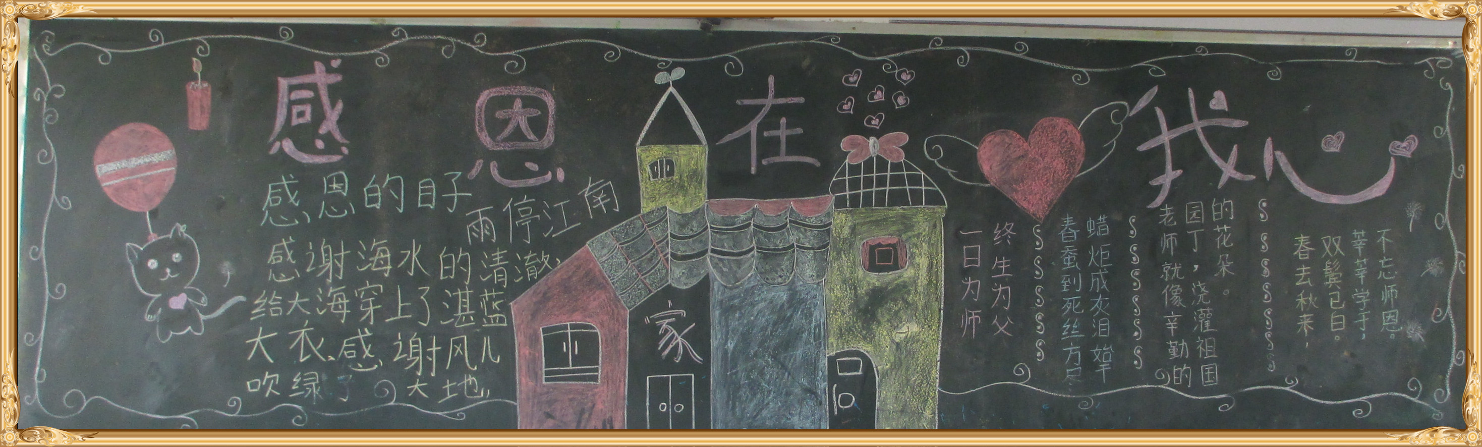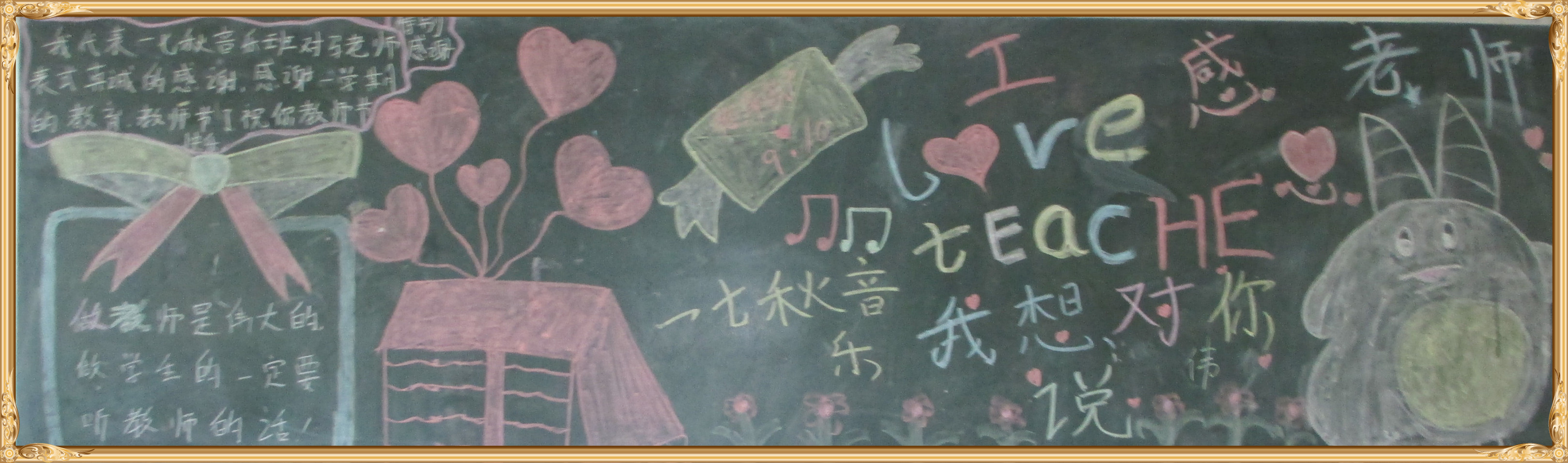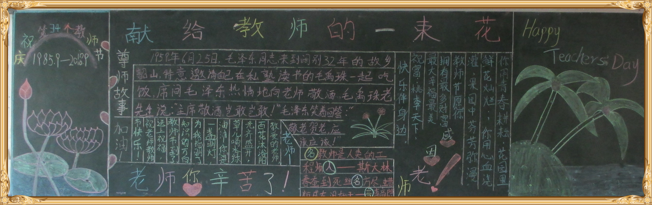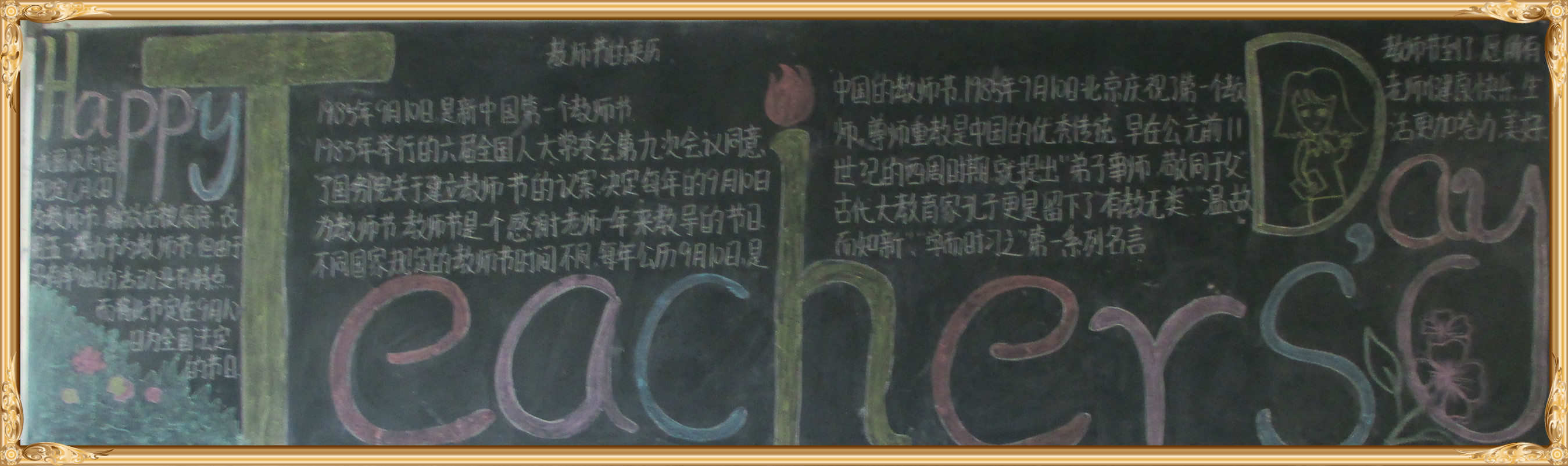 金秋九月,我们迎来了第34个教师节。习总书记在北京师范大学师生代表座谈时讲到:“教师是人类历史上最古老的职业之一,也是最伟大、最神圣的职业之一,自古以来,中华民族就有尊师重教的优良传统……”为了感恩教师的辛勤付出和无私奉献,我校学生用一幅幅“感恩教师节”黑板报表达了对教师的感恩之情。