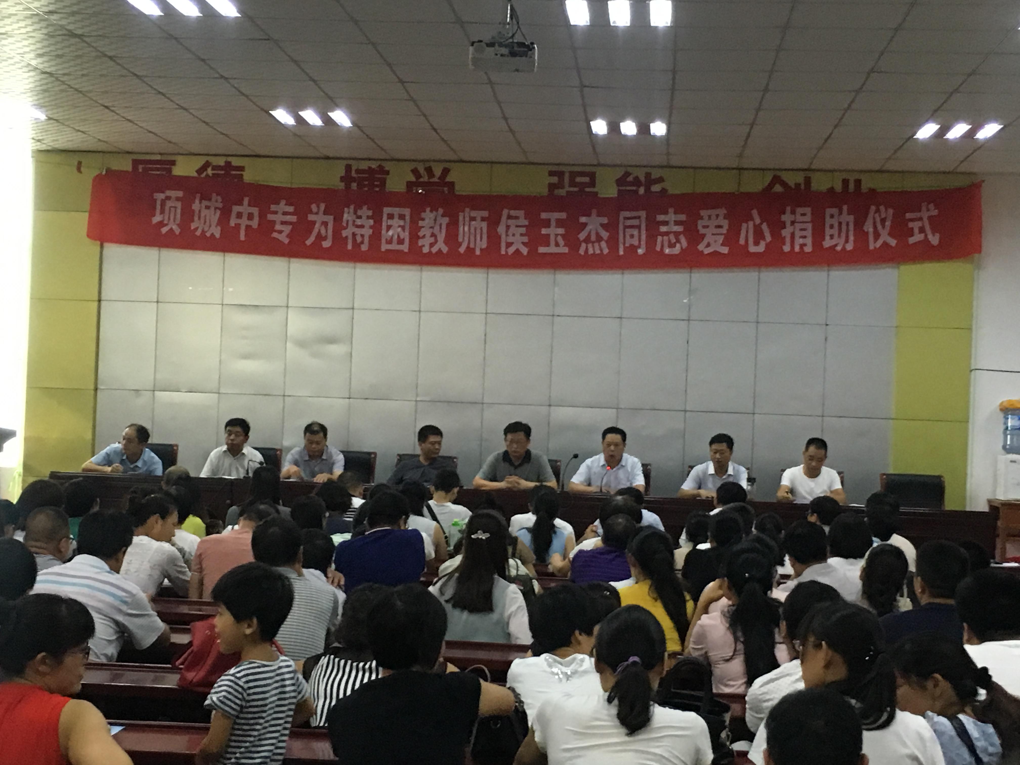 一方有难,八方支援。2017年8月,项城中专教师侯玉杰同志,其爱人7月下旬在郑大一附院被确诊为癌症后,8月份侯玉杰老师又被查出患有脑瘤,需要治疗费用高达40万元。消息传出,校工会主席潘志刚立即召开工会委员会议,由校工会向全校教职工发出了“爱心捐款倡议书”,立即得到了全体教职工的积极响应,纷纷伸出援助之手,积极参加到这次“献爱心捐款”活动中来,点点爱心,汇聚成河,无私助人,温暖真情。本次活动共募捐到16000余人民币。