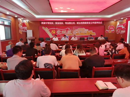 承诺与责任-------记我校安全工作签字仪式为加强学校安全管理,强化和落实安全主体责任,维护学校安全稳定,促进平安和谐校园建设,5月10日下午4:30,项城中专全体专业部主···