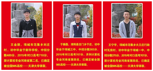 来自项城市范集乡刘庄村的王金朋同学以710分居河南省计算机专业第2名,淮阳县豆门乡于庄的于振磊同学、项城市范集乡大王庄行政村瓦房村的王宁宇同学分别以707分并列河南省计算机专业第4名,以上三名同学拟被全国985重点高校――天津大学录取。