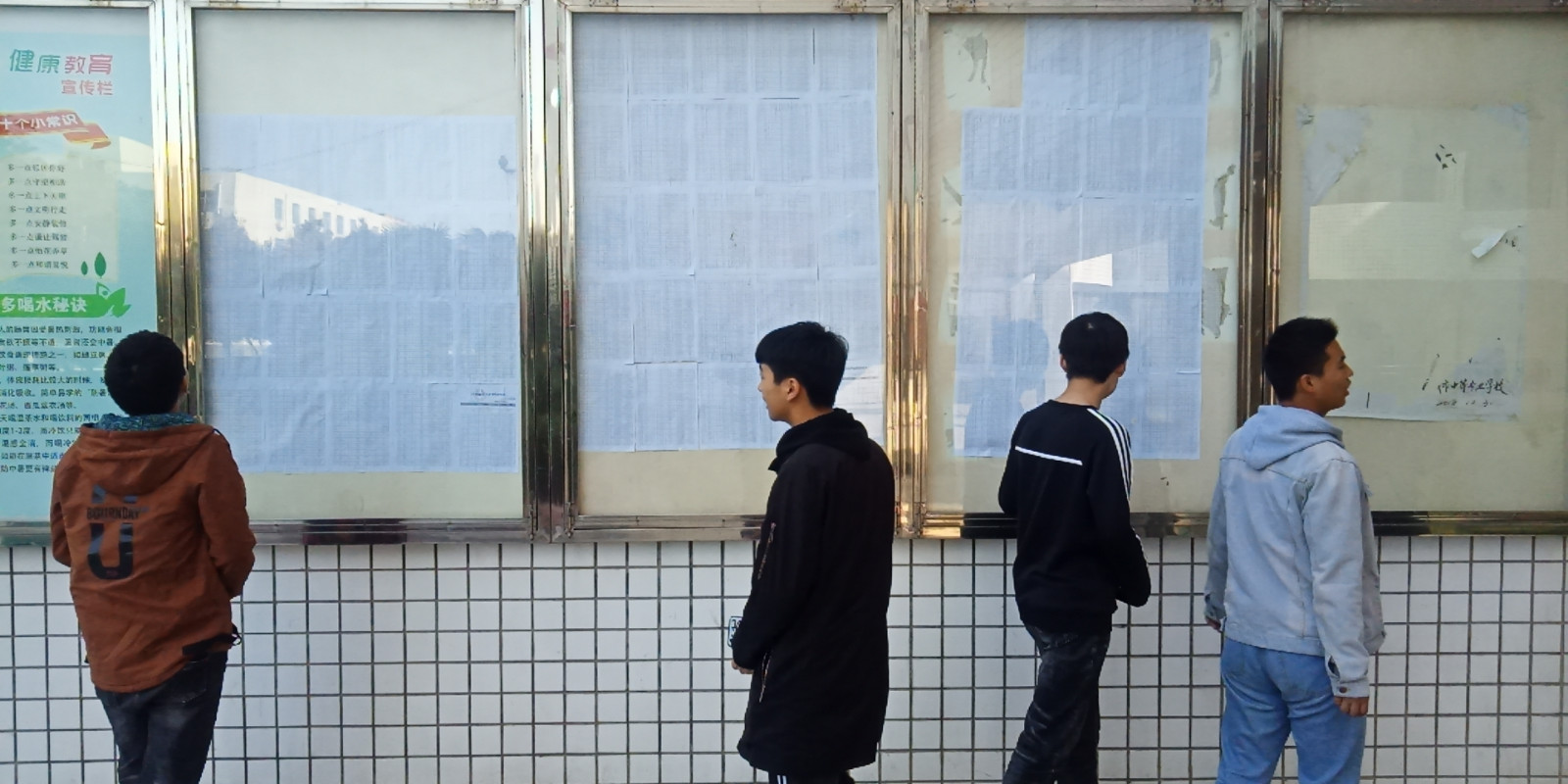 在北教学楼东边围了许多学生一直在盯着墙上的公示栏,高兴的用手指着,嘴里喊着,黄某某我找到你的名字了,你上榜了···